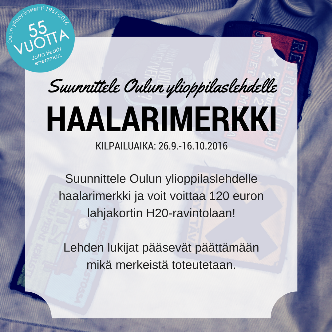 Tässä vielä tarkemmat ohjeet ja liitteessä kuva, jota voi jakaa: Suunnittele Oulun ylioppilaslehdelle haalarimerkki lehden 55-vuotisjuhlavuoden kunniaksi. Lukijat pääsevät äänestämään 17.-23.10. suosikkimerkkinsä, joka toteutetaan. Voittaja eli toteutettavan merkin suunnittelija voittaa 120 euron lahjakortin H2o-ravintolaan sekä mainetta ja kunniaa.
