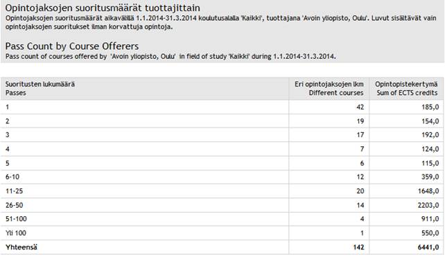 Alla Sisusta otettu avoimen yliopiston ensimmäisen neljänneksen tulos. Nousua edellisen vuoden vastaavaan aikaan on 7,5 % (449 op). Nousu näyttää siis jatkuvan. Alla Sisusta otetut taulut.