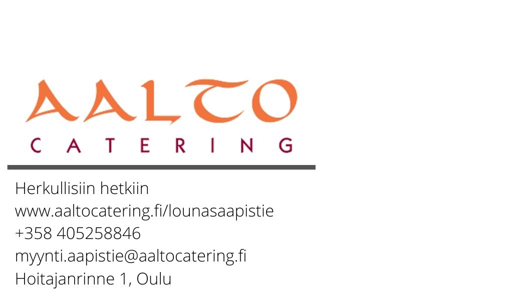 Ystävällisin terveisin, Sanna [Käyntikortti]https://www.aaltocatering.fi/lounasaapistie/ [Facebook] https://www.facebook.com/Aalto-Catering-109161454074449 [Instagram] https://www.instagram.com/aaltocatering/