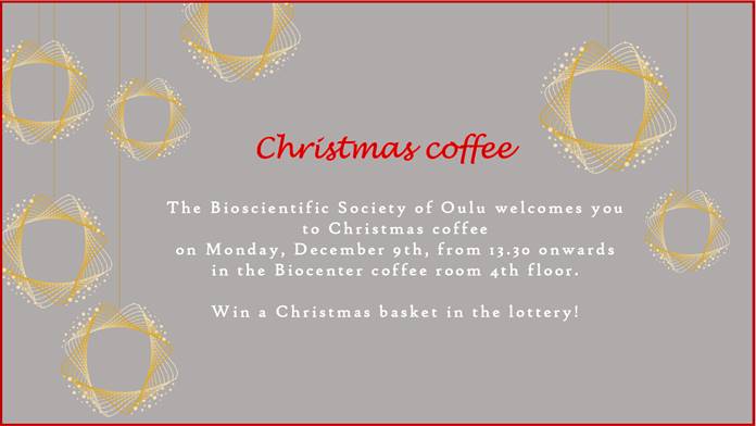 we would like to welcome the staff of Kieppi to enjoy the Bioscientific Society of Oulu Christmas coffee on Monday, December 9th, from 13.30 onwards in Biocenter's 4th floor coffee room (456B). In addition to the coffee you can participate in the Christmas basket lottery.