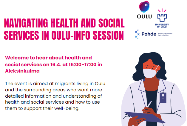 * Patio ENhttps://patio.oulu.fi/en/events/navigating-health-and-social-services-oulu-info-session FIhttps://patio.oulu.fi/fi/tapahtumat/terveys-ja-sosiaalipalvelut-maahanmuuttajille * Oulu.fi ENhttps://www.oulu.fi/en/events/navigating-health-and-social-services-oulu FIhttps://www.oulu.fi/fi/tapahtumat/terveys-ja-sosiaalipalvelut-maahanmuuttajille-infotilaisuus [cid:image001.png@01DA899C.55F14670]