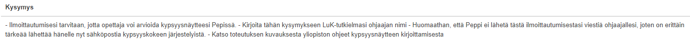 Opiskelijoille on ilmoittautumisen yhteyteen laitettu pakollisia kysymyksiä, sekä ohjaustekstejä: