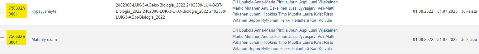 Tälle lukuvuodelle on Peppiin perustettu kaksi toteutusta (FM-kypsyysnäyte näkyy Pepin näkymässä englanniksi, tämä johtuu vai siitä että kielimäärityksissä sen voi suorittaa joko suomeksi tai englanniksi ja e on aakkosissa ensin).
