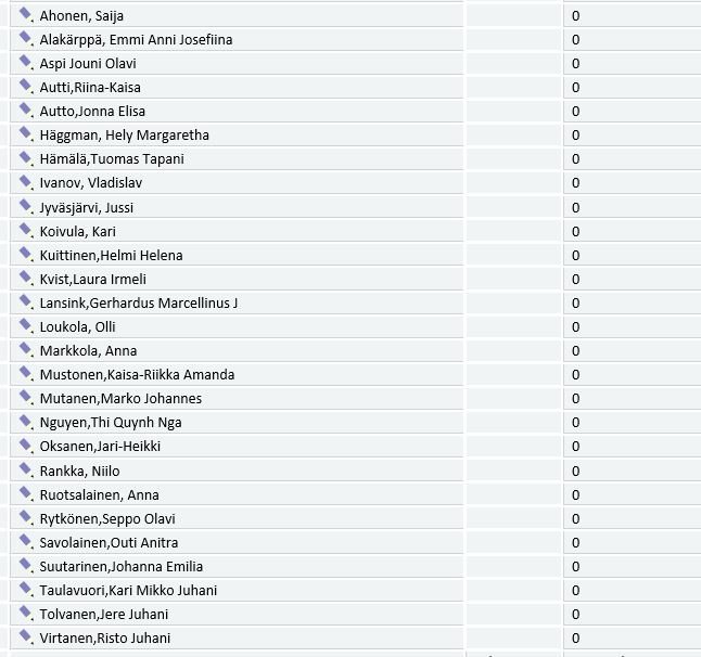 Ohessa vielä lista henkilöistä joilla ei ole vielä SOLE-kirjauksia joulukuulta. Mikäli teillä on projeteille meneviä työtunteja niin käykää kirjaamssa ne TÄNÄÄN (Jussi ja Annu ovat toki laittaneet jo tuntinsa vaikkakin näkyvät vielä listauksessa).
