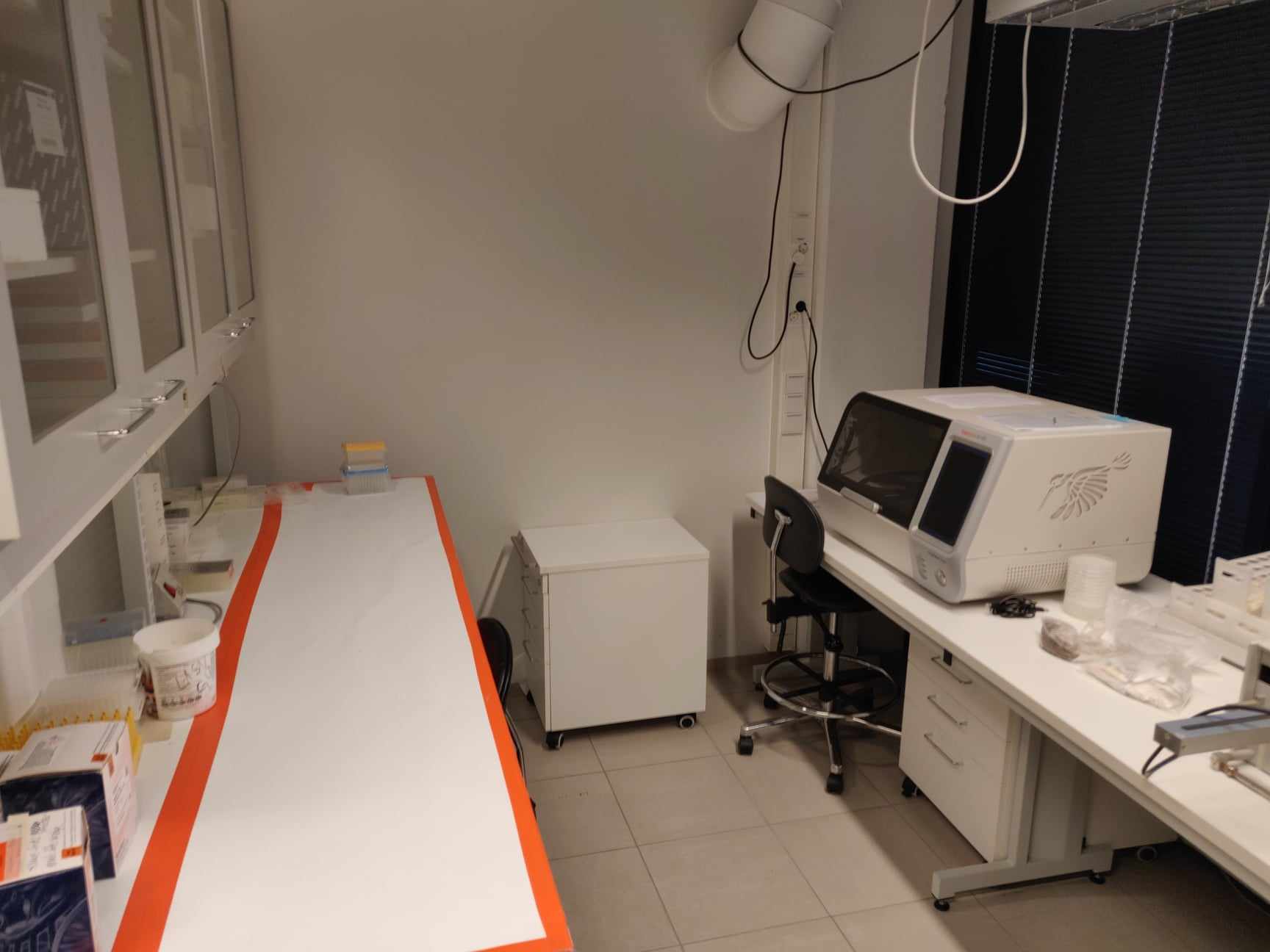 B159, tables around the KingFisher DNA-extraction machine: People using this space, please clean the tables from extra plates and unmarked samples. Kits could be placed in the cabinets(?)