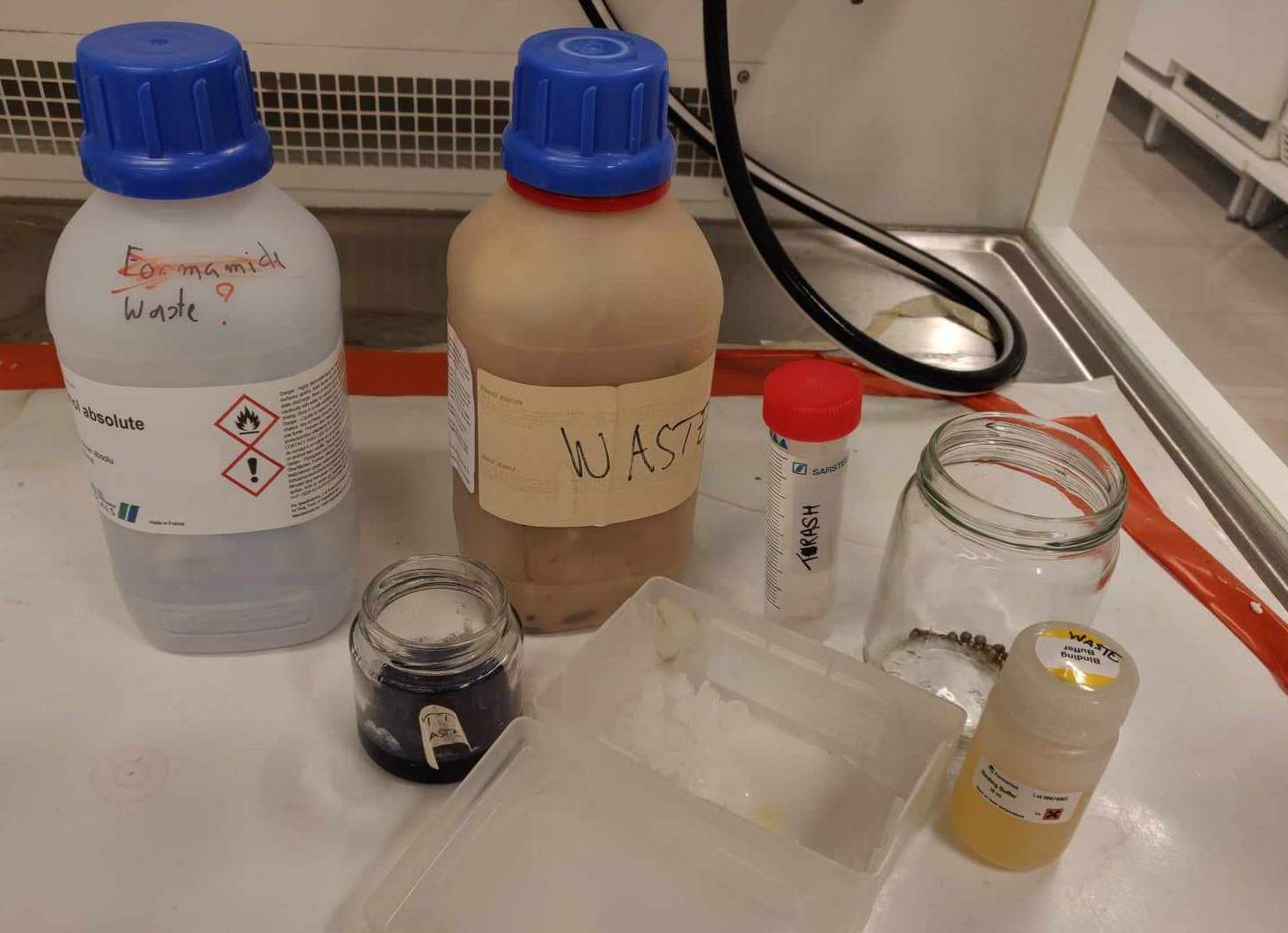 More information how to properly mark or dispose your waste can be found from the Ecology and Genetics Laboratory Guide (found from coffee room, S-drive->Biologia->Yhteiset, or molecular lab table B167a) or you can ask help from our laboratory technicians.
