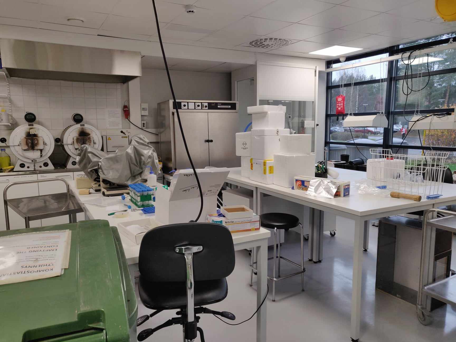1. As it was completely full, we emptied the sterilization oven in solvent labs to the table (picture). If you have something in your current work that needs to be sterile you can lift it back inside the oven. 2. We will sort the deep freezers once we get the new one. I will let you know the date for that later on. 3. The IT trash will be taken away on Friday either 9-10AM or 12+. If there are big stashes of old office leftovers nearby to your place, please let me know and we can throw those away at the same time.