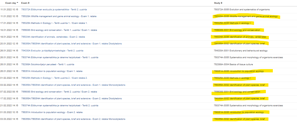 Siellä on tällä hetkellä nämä biologian uusinnat (tänne tullaan lisäämään myös kevään kurssien uusintatentit myöhemmin):