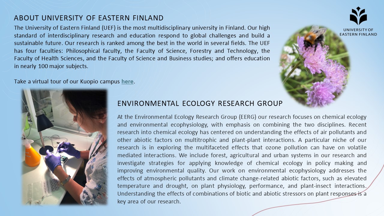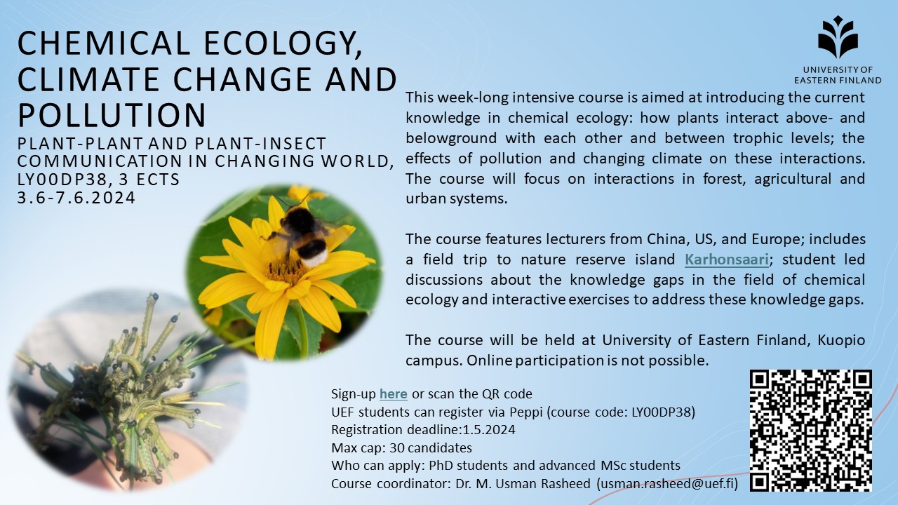 We are arranging an advanced level course in chemical ecology at UEF, Kuopio campus. Some of our international collaborators are coming to lecture the course. I think it will be an amazing opportunity for PhD students and advanced MSc students to attend the course. Please spread the word. Also, the .pdf of the info is attached with the email.