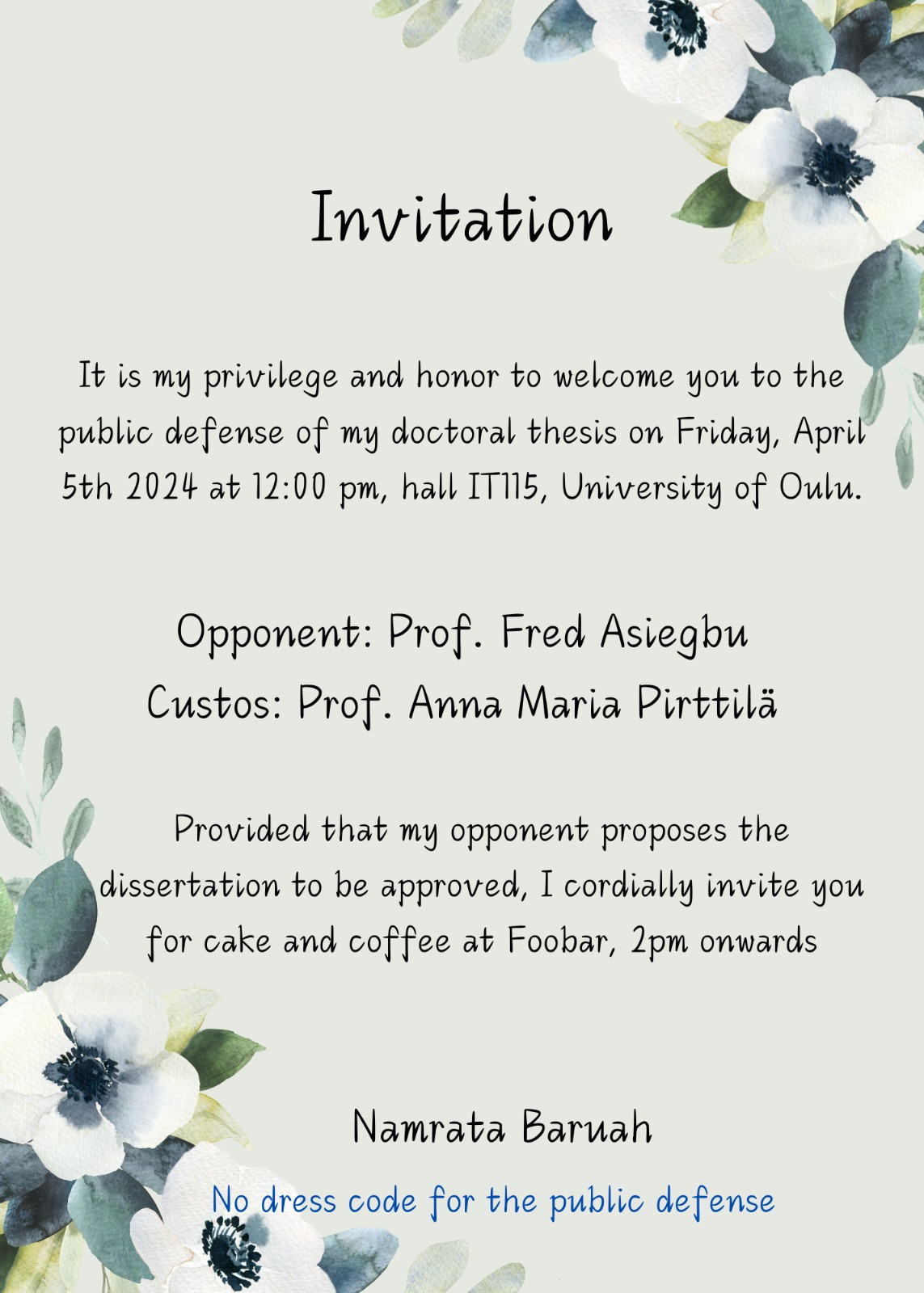 I would like to invite you all to the public defense of my doctoral thesis this Friday, the 5th of April, at auditorium IT115 starting at 12pm and coffee and cake afterwards at restaurant Foobar.