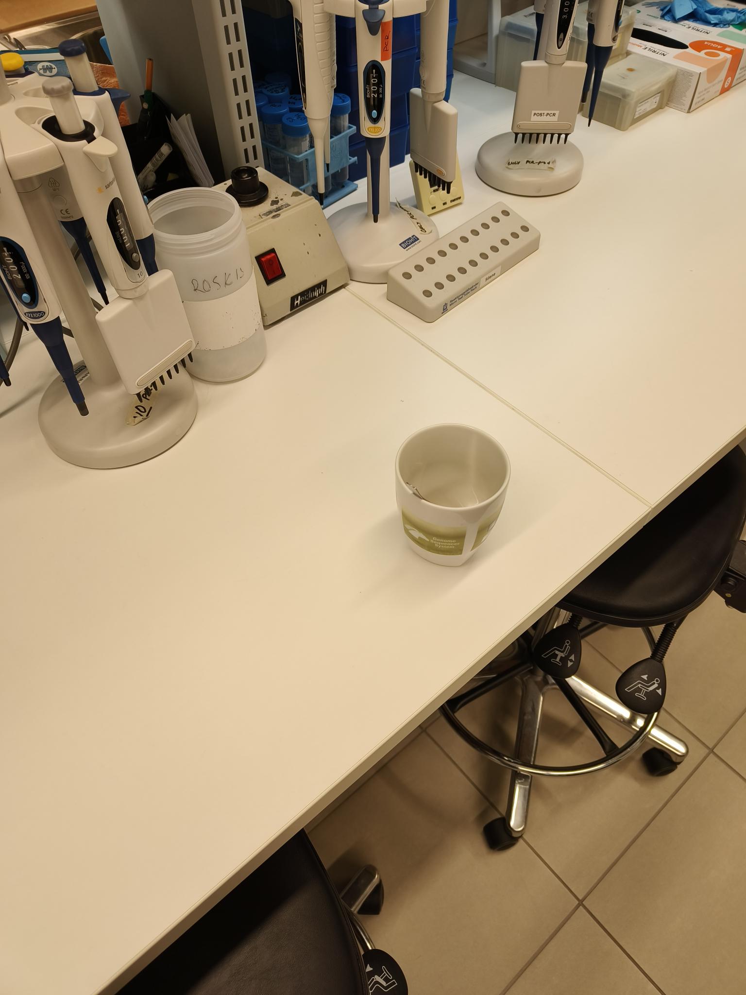 Please remember that food or drinks are not allowed in laboratory! The cup is now in the coffee room if someone misses it (thank you Laura T for taking it there).
