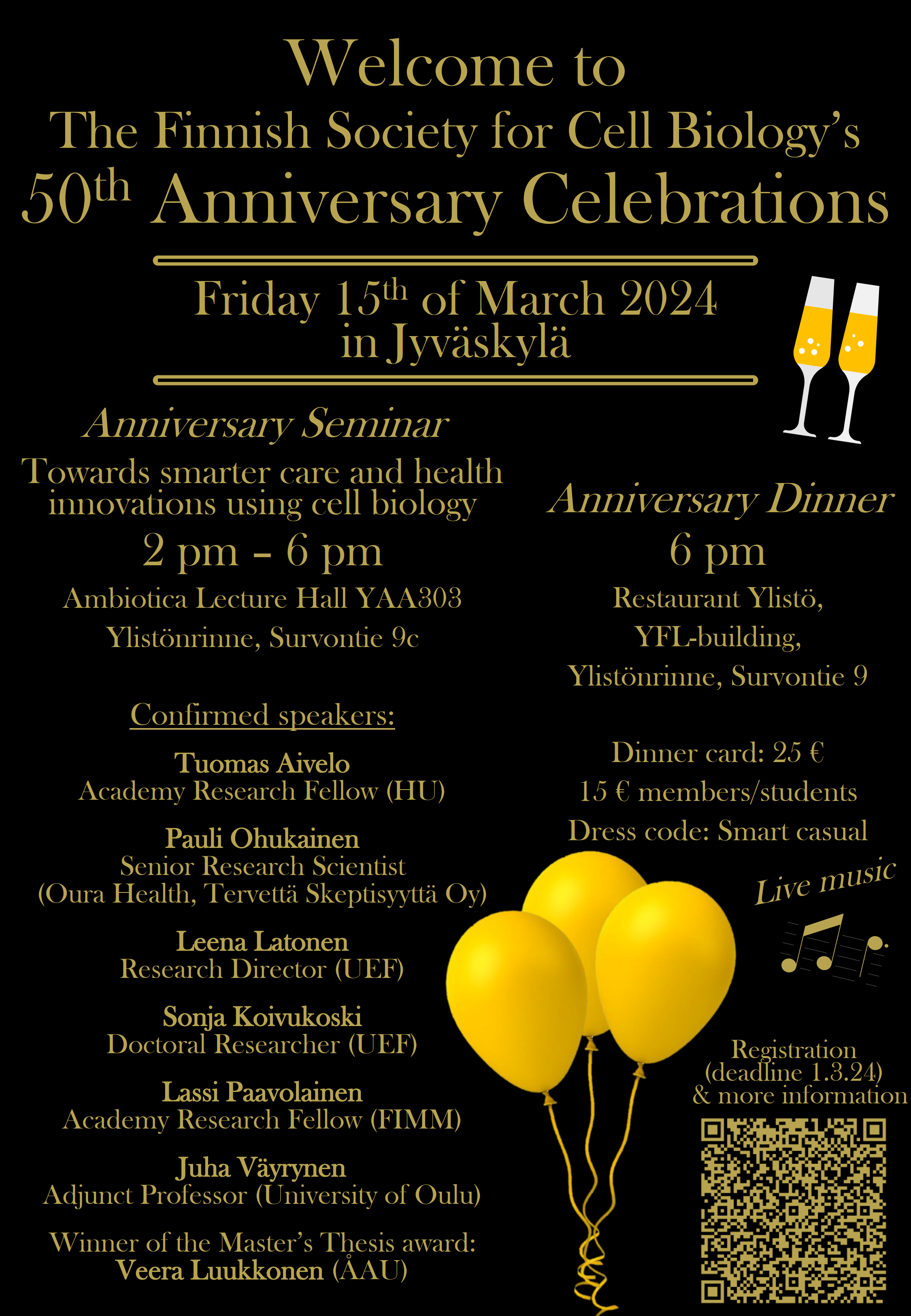 Welcome to celebrate The Finnish Society for Cell Biology's 50th anniversary on Friday 15th of March in Jyväskylä! We'll first have an anniversary seminar with great science and timely topics, followed by an anniversary dinner with live music.