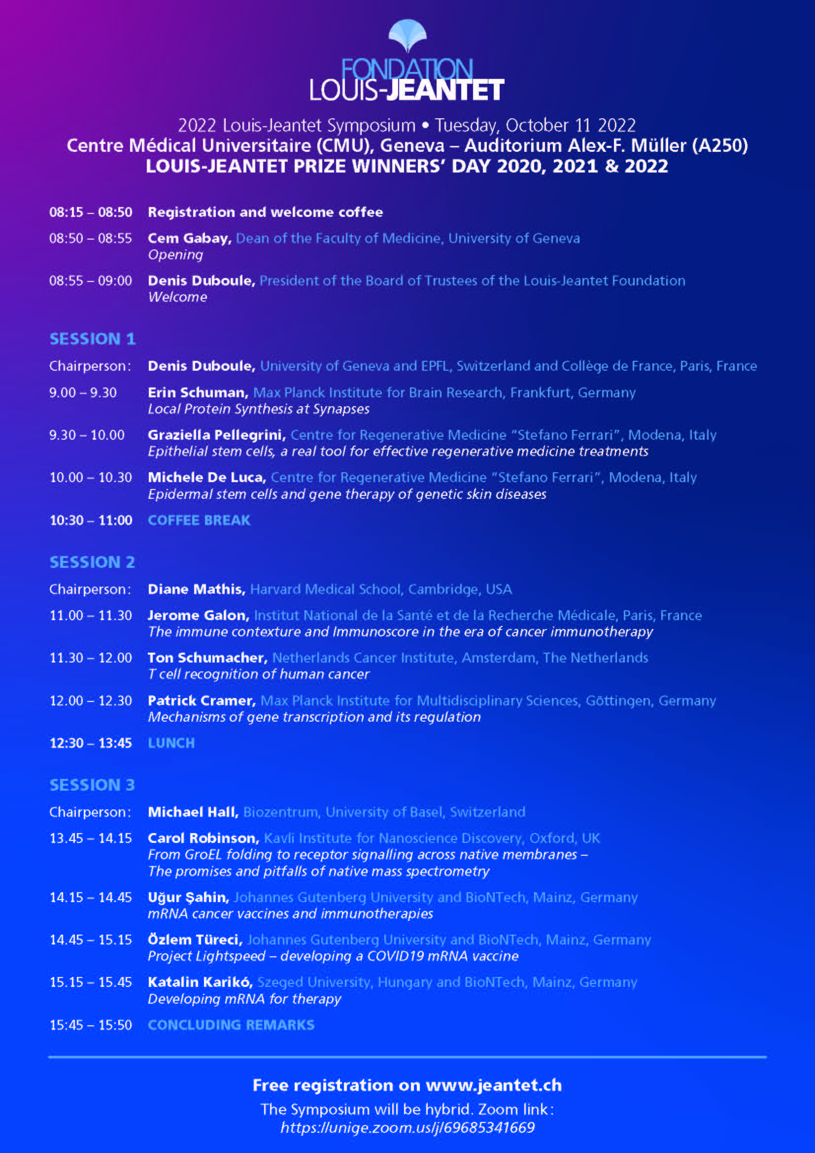From: owner-grp-alitalo@helsinki.fimailto:owner-grp-alitalo@helsinki.fi <owner-grp-alitalo@helsinki.fimailto:owner-grp-alitalo@helsinki.fi> on behalf of Emilia Carlsson / Biomedicum Helsinki <emilia.carlsson@biomedicum.fimailto:emilia.carlsson@biomedicum.fi> Date: Monday, 10. October 2022 at 9.03 To: Subject: Louis-Jeantet Symposium on October 11, 2022 This year's exceptional 2022 Louis-Jeantet Symposium on October 11th 2022. The 2022 Symposium is a free event, does not require registration, and can be followed by Zoom on https://unige.zoom.us/j/69685341669.