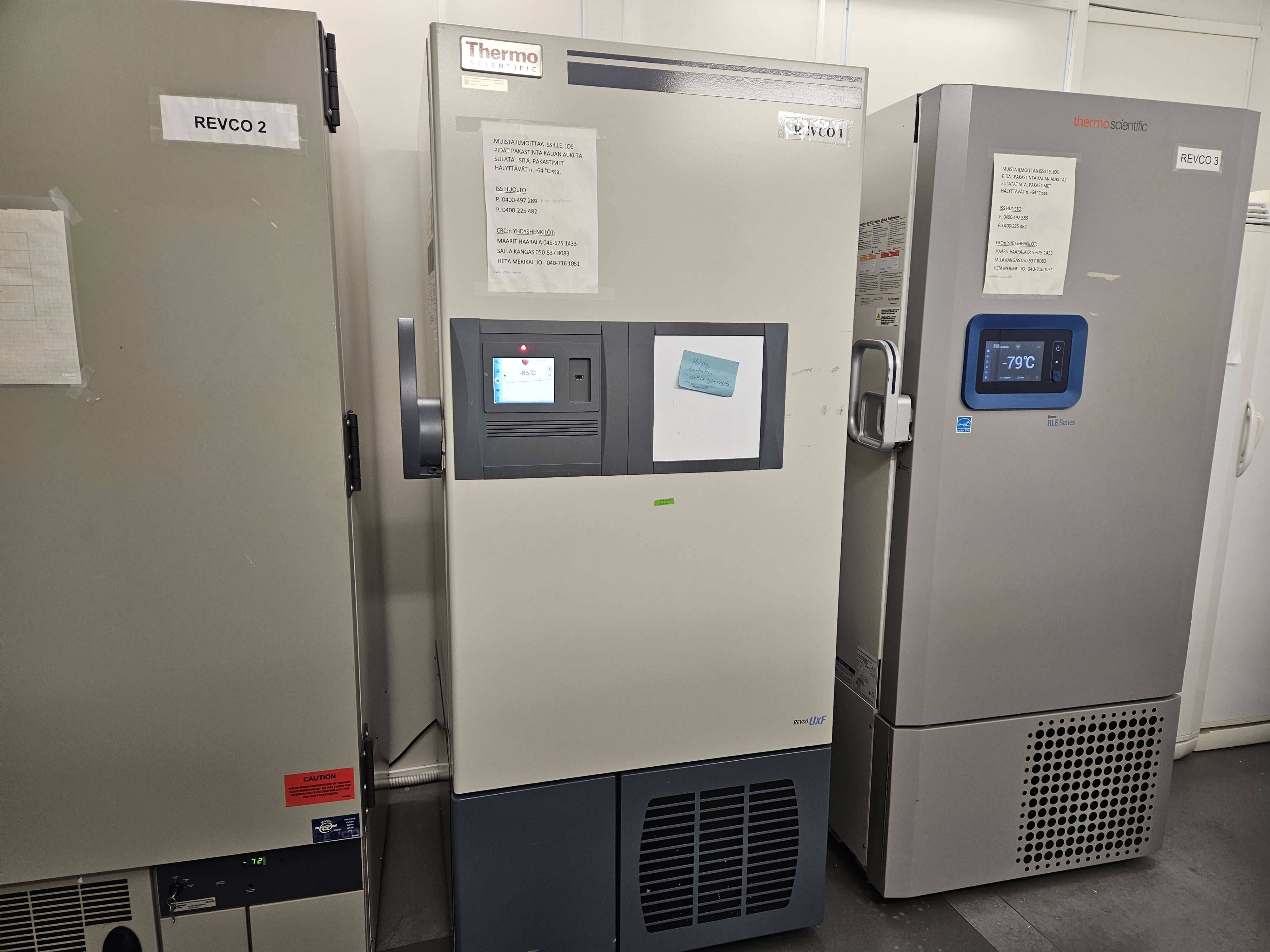 Pakastinhuoneen keskimmäinen -80C pakastin (kuvassa) on mennyt rikki ja sen lämpötila oli tänä aamuna -64C. Pakastimen sisältö siirretään Kiepin kellarikerroksessa olevaan varapakastimeen.