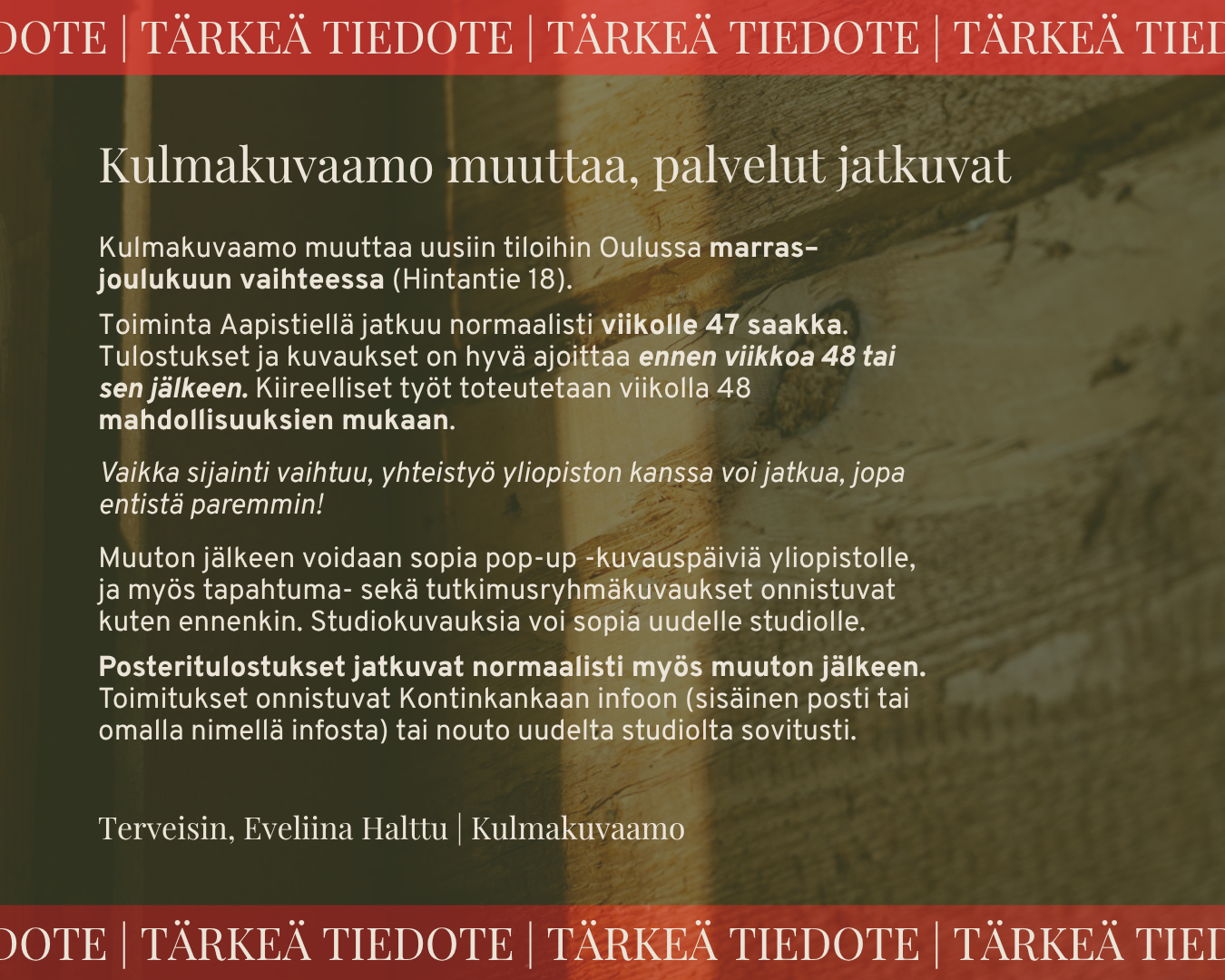 From: Eveliina Halttu kulmakuvaamo@gmail.com Sent: Friday, October 24, 2025 10:17 AM To: LTK ltk-staff@oulu.fi; LTK-idm LTK-idm@oulu.fi; fbmm fbmm@lists.oulu.fi Subject: Kulmakuvaamo vaihtaa sijaintia / Kulmakuvaamo relocates