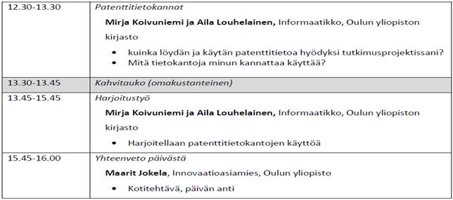 Obs! This course is in Finnish but the similar course from patent databases will be arranged in English in spring 2015! Patentit sisältävät suuren määrän tietoa, jota ei läheskään aina löydy tieteellisistä julkaisuista. Kun suunnittelet uutta tutkimusprojektia, selvitä artikkelien lisäksi mitä patenteista löytyy. Tee vaikutus rahoittajaan osoittamalla, että myös patenttien sisältämä tieto on hallussasi hakiessasi tutkimusrahoitusta. Tule kurssille ja opi etsimään tutkimusaiheeseesi liittyviä patentteja. Saat myös vinkkejä siitä, miten niitä kannattaa lukea. Kurssilla opitaan näitä asioita tekemisen kautta. Milloin: 4.12.2014 klo 9.15-16 Missä: TL103 (Tellus-kirjasto Linnanmaan kampuksella) Kenelle: jatko-opiskelijoille, väitelleille tutkijoille, senioritutkijoille ja kaikille aiheesta kiinnostuneille Ilmoittautuminen: WebOodiinhttps://weboodi.oulu.fi/oodi/ (kurssikoodi 920013J) tai sähköpostilla (maarit.jokela@oulu.fimailto:maarit.jokela@oulu.fi) 28.11. mennessä Kurssiohjelma liitteenä ja viestin lopussa. Lisätietoja: Maarit.Jokela@oulu.fimailto:Maarit.Jokela@oulu.fi, puh. 040 355 9660 Tervetuloa! - Maarit -