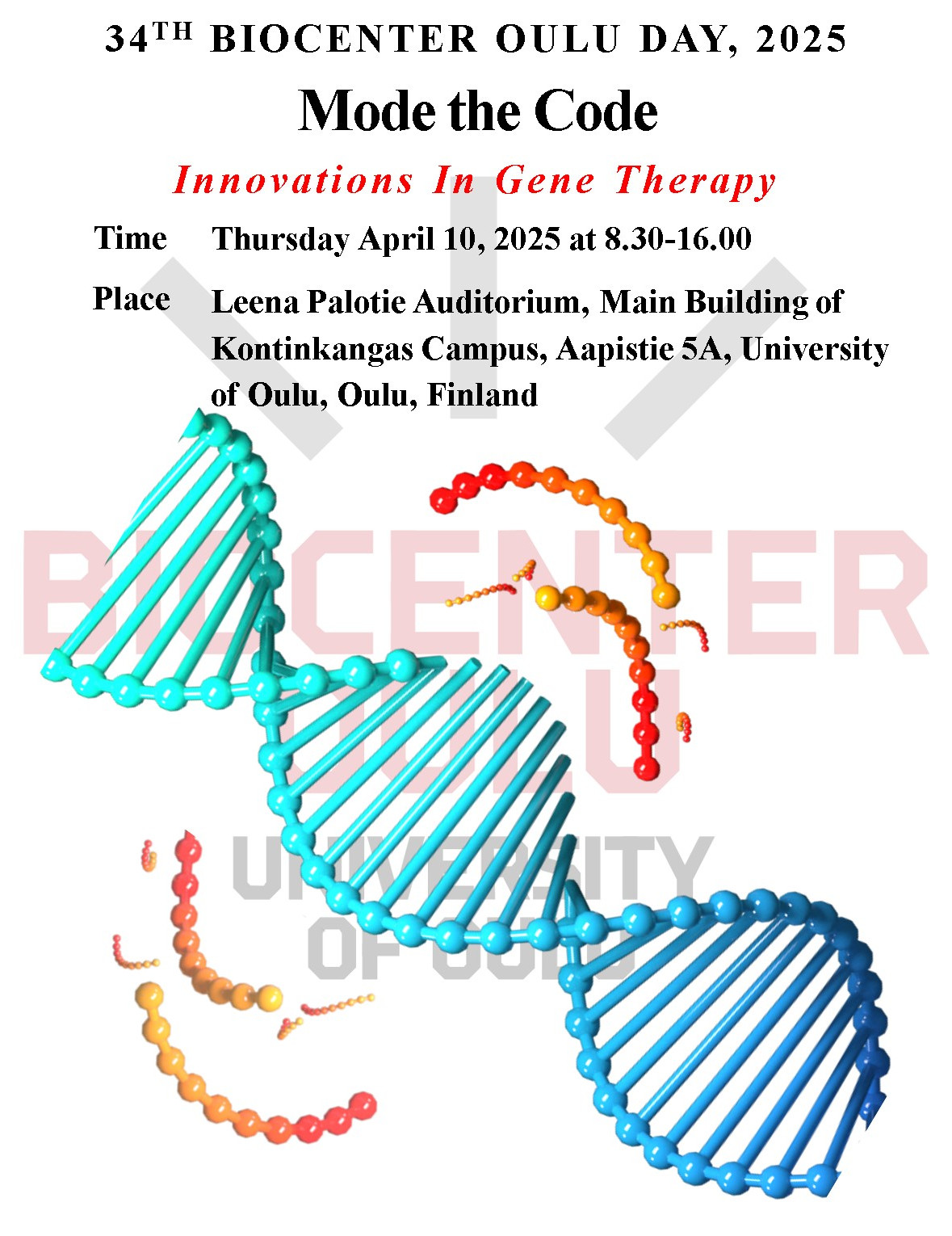 Dear all, A kind reminder of the Biocenter Oulu Day 2025 and call for min-posters. We are pleased to announce again that the 34th Biocenter Oulu Day 2025 " Mode the Code – Innovations in Gene Therapy " will be organized on Thursday, April 10, 2025, at the Kontinkangas campus, Auditorium Leena Palotie (101A).