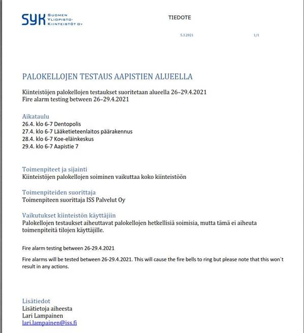 From: Juhani Vänttilä juhani.vanttila@oulu.fi Sent: 15. huhtikuutata 2021 9:45 To: Juhani Vänttilä juhani.vanttila@oulu.fi Subject: Palokellojen testaus aapistien alueella 26-29.4.2021