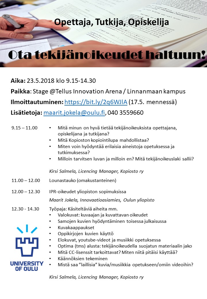 tel. +358-40-355 9660 Internal mail: Maarit Jokela / Innovaatio- ja yrittäjyyspalvelut Room: M207 / Linnanmaa campus