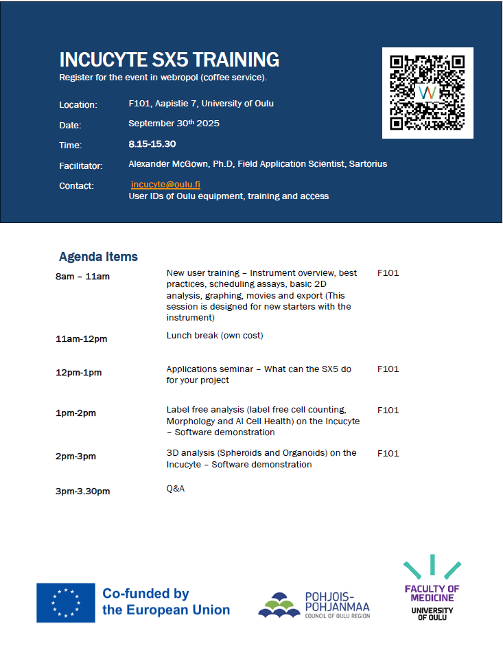 We are happy to let you know that the live-cell imaging capacity at the Medical Faculty will be increased and updated while we get a new Incucyte SX5 equipment running alongside the current Incucyte S3. We welcome you to learn more about the new equipment on September 30th 2025 in the lecture hall F101, Aapistie 7. Please register trough the link below for the coffee service.