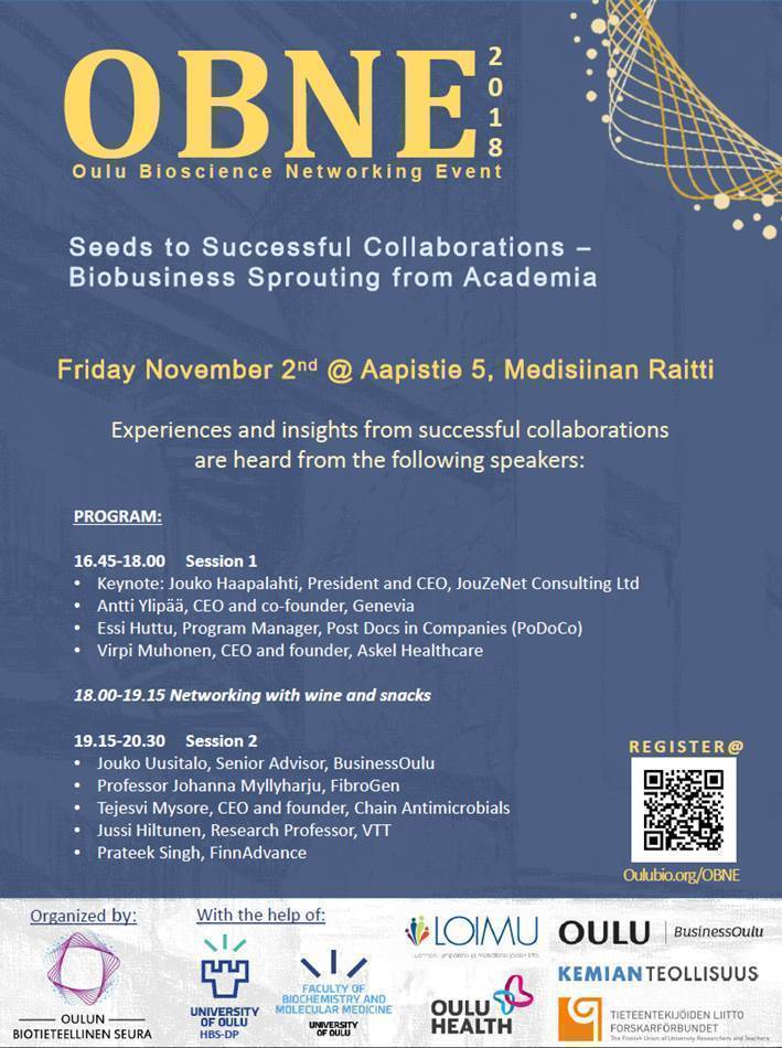 This year the theme of OBNE is "Seeds to Successful Collaborations - Biobusiness Sprouting from Academia". We are very proud to have the CEO of Genevia, Antti Ylipää, and the CEO of Askel Healthcare, Virpi Muhonen, as visiting speakers as well as to hear our very own success stories from Oulu.