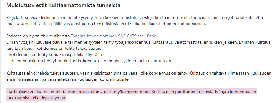 Jokaisen tulee käydä kuittaamassa omat SAP CATS työajankohdennukset säännöllisesti ja mielellään kerran kuukaudessa.
