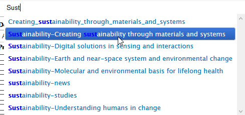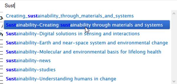 * Make sure that your research project is tagged with one of the following sustainability tags (based on the focus area of your project): * Sustainability-Creating sustainability through materials and systems * Sustainability-Digital solutions in sensing and interactions * Sustainability-Earth and near-space system and environmental change * Sustainability-Molecular and environmental basis for lifelong health * Sustainability-Understanding humans in change * The tags are already in the system and you can find them by writing in the Administrative tags field ’sust’ and the system will offer you the different tag options in the following manner: [/var/folders/6q/smg74zc503g49c4_wgtrlwbm0000gn/T/com.microsoft.Outlook/WebArchiveCopyPasteTempFiles/cidimage001.png@01D51D18.93A74050]