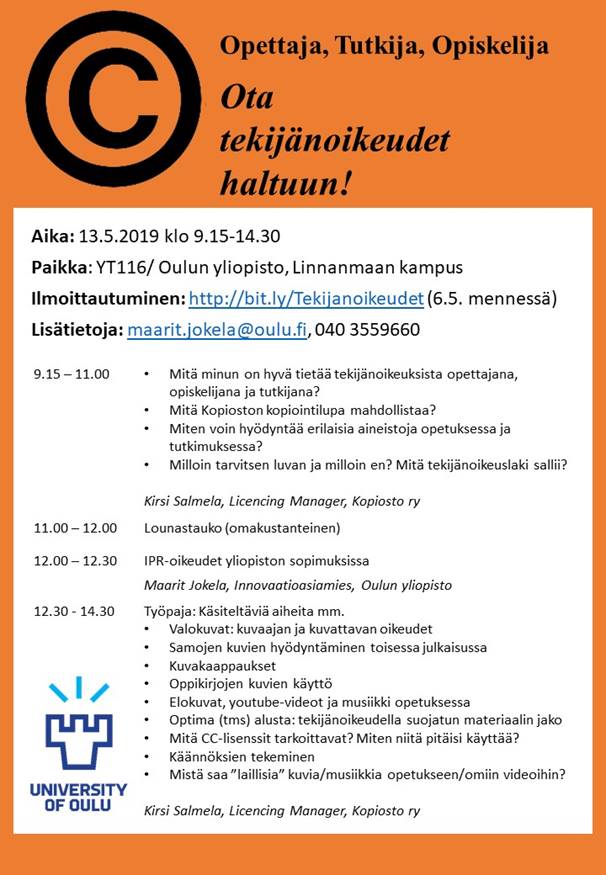 Obs! This advertisement concerns copyright training. It will be kept in Finnish in May 13th but in the autumn the same course will be arranged in English.