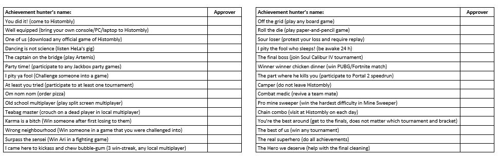 We would remind that you are warmly welcome to Histombly 2018 event that has already started and will be held from 6th of April to 8th of April 2018 (6.-8.4.2018)! Histombly 2018 is an event organized by Histoni ry, where all members or their friend can play computer, board or console games and watch a movie called Gamer (http://www.imdb.com/title/tt1034032/). Also, there will be gaming tournaments and fantastic prizes for participants in the tournaments!