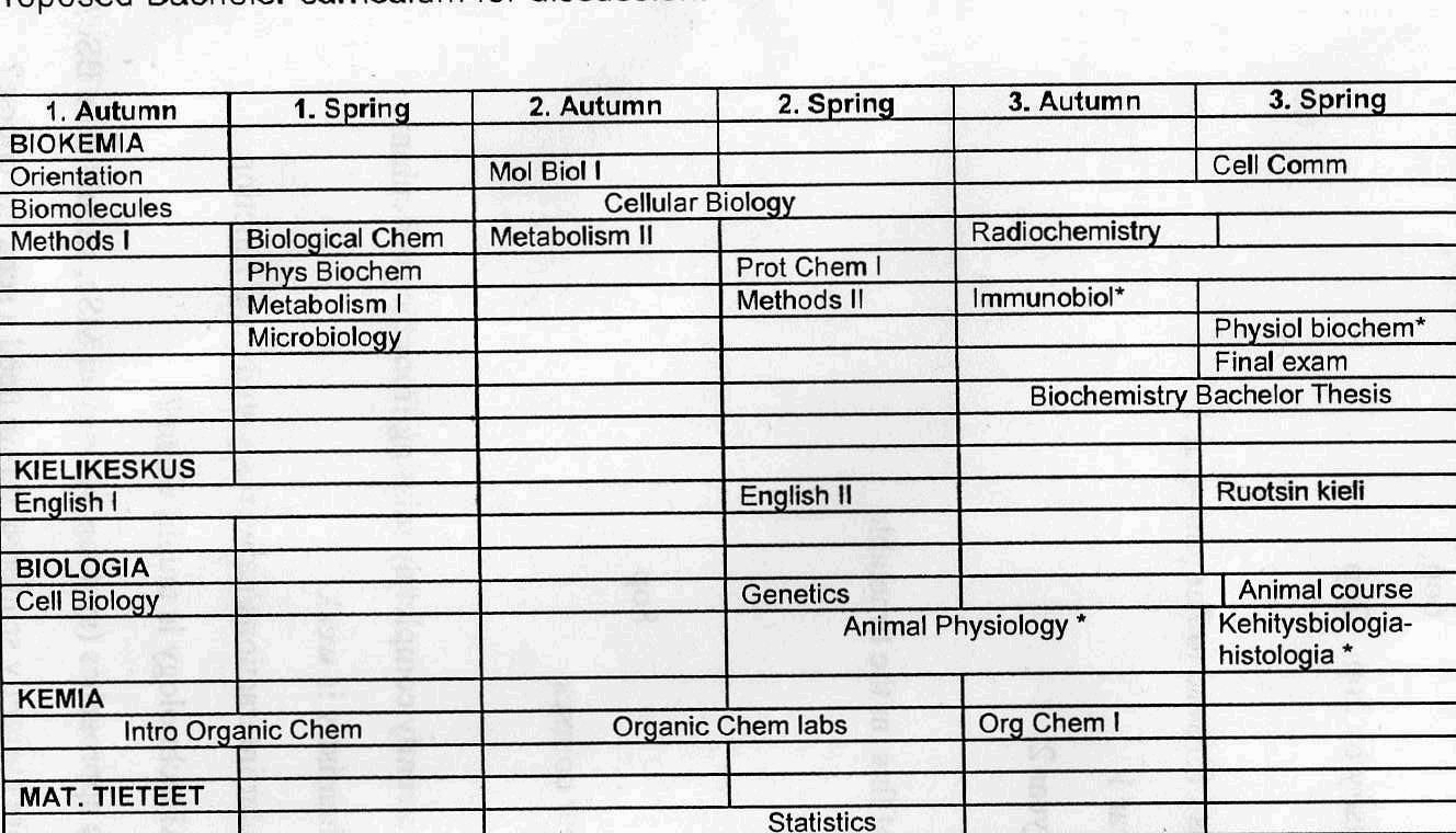 Biokemian laitos on muuttamassa kandivaiheen opetussuunnitelmaansa vastaamaan viimeaikaista palautetta. Tämän viestin liitteenä on kaksi kuvaa, joissa ko. muutosehdotukset ovat. Pyydän, että katsotte ne läpi ja annatte palautetta minulle. Kun olen saanut tarpeeksi palautetta, kerään (ja tulkkaan englanniksi) kaiken palautteen ja lähetän sen eteenpäin.