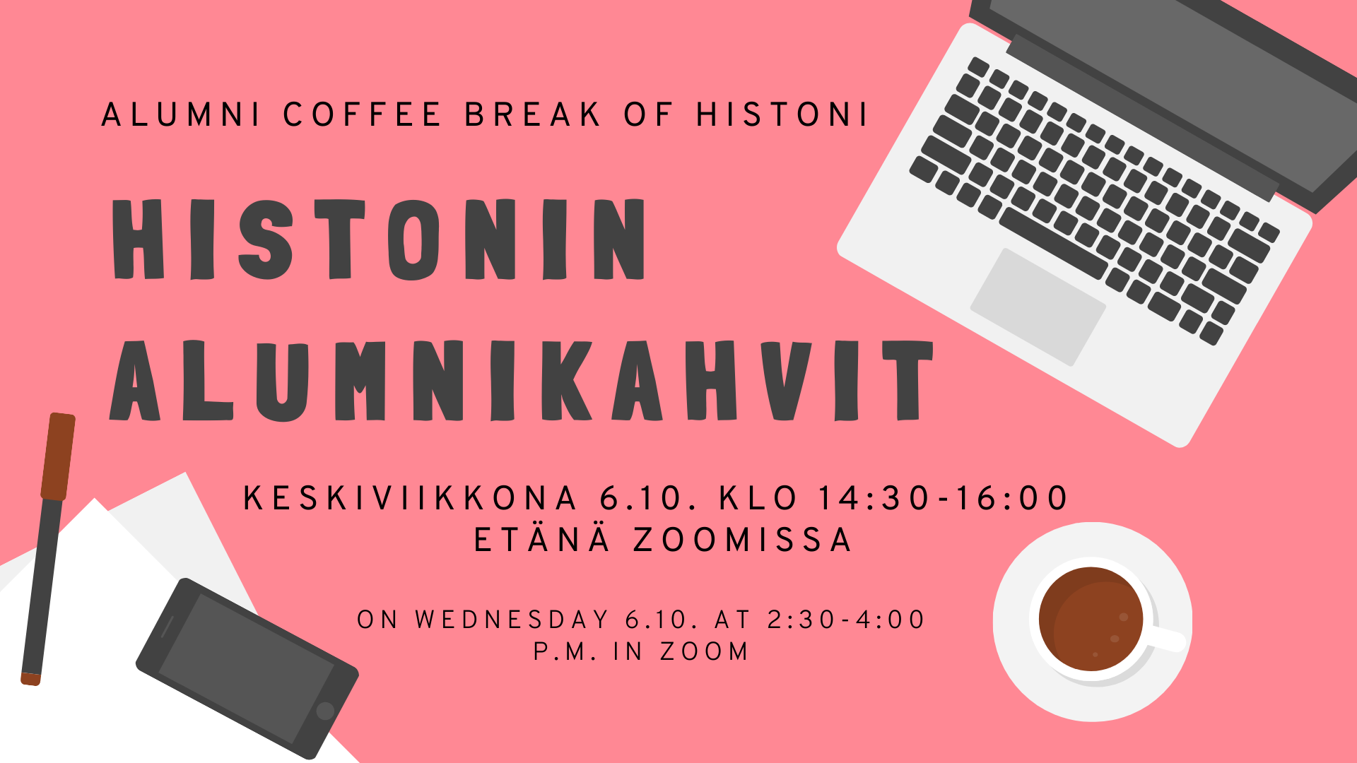 Vuoden viimeisillä alumnikahveilla vieraaksemme saapuvat Martha Ingola (valmistunut KV-maisteriohjelmasta), Jussi Talvitie (Finnadvance) ja Juha Kerätär (Admescope). Alumnit esitellään tarkemmin Histonin somessa ennen tapahtumaa, joten tykkää Histoni ry:n FB-sivusta ja seuraa meitä Instagramissa @histoniry.