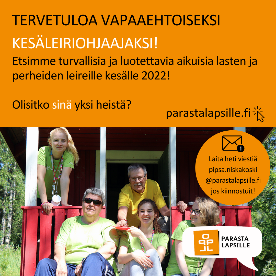 Voit ottaa myös suoraan yhteyttä vapaaehtoistoiminnan koordinaattori Pipsaan p./whatsapp: 050 3552540 tai sähköpostilla: pipsa.niskakoski@parastalapsille.fi
