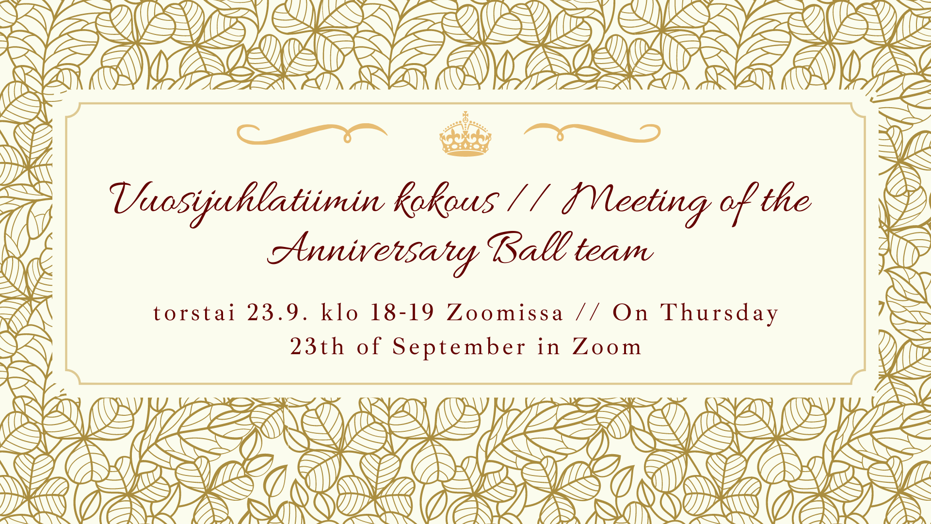 Vuosijuhlatiimin kokous to 23.9. klo 18-19 Zoomissa // Meeting of the Anniversary Ball team on Thu 23th of September at 18-19 in Zoom