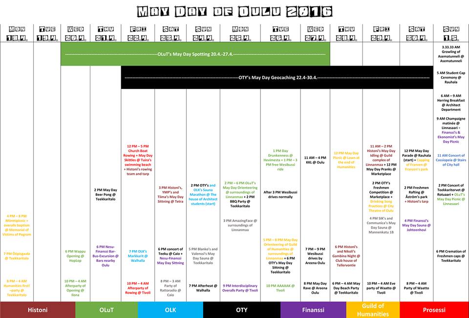 Mon 22th of February - Thu 25th of February 2016 (22.-25.2.2016) May Day week @ Center of Oulu and its surroundings Look at your calender and book some time for May Day celebration! You can also find some information regarding May Day from OTY ry's web page during May Day, but unfortunately it is in Finnish (http://www.paraswappu.fi/).