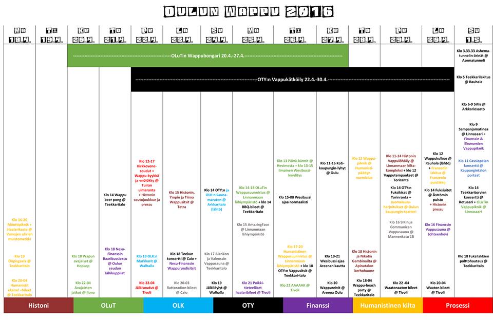 Viikko 16 ja 17 Vapun tapahtumat @ Oulun keskusta ja lähiympäristö Kannattaa jo varata kalenterista aikaa opiskelijavapulle, sillä tänäkin vuonna on luvassa kaikenlaista jännää! Luvassa on muun muassa Kirkkovenesoudut, Ashematunnelin örinä, sitsejä ja Vappupiknik. Vapun tapahtumia kannattaa katsoa myös Oulun Teekkariyhdistyksen sivuilta vapun aikana (http://www.paraswappu.fi/).