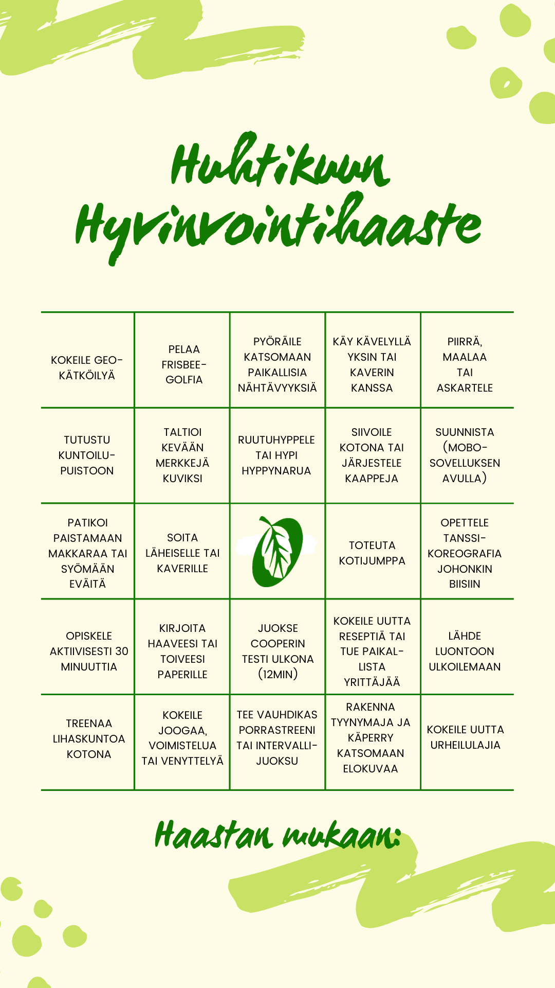 Tarkoituksena on piristää ja takoa energiaa kiireisen kevään keskelle. *Huhtikuun Hyvinvointihaaste järjestetään 1.-30.4.2021*, jonka aikana keskitytään hyvinvoinnin eri osa-alueisiin, niin henkiseen, sosiaaliseen kuin fyysiseenkin.