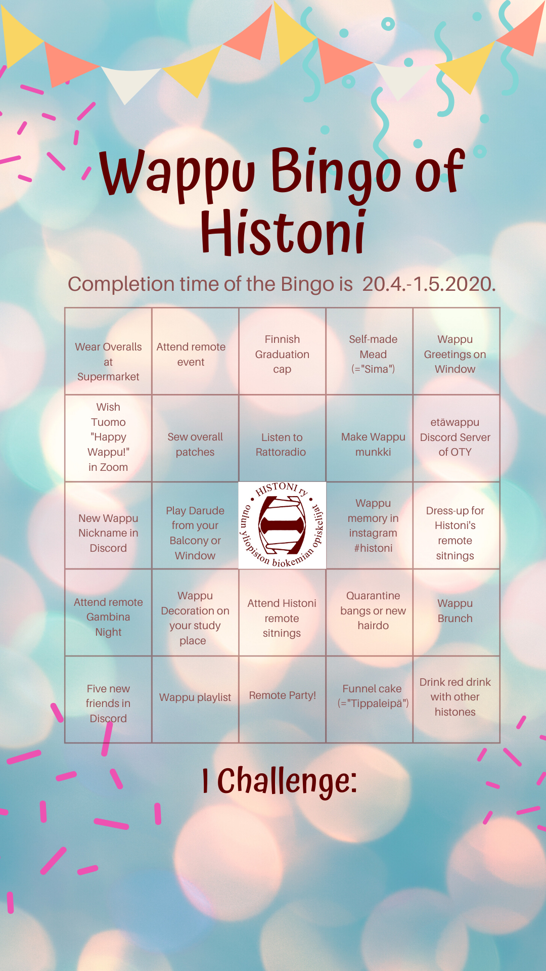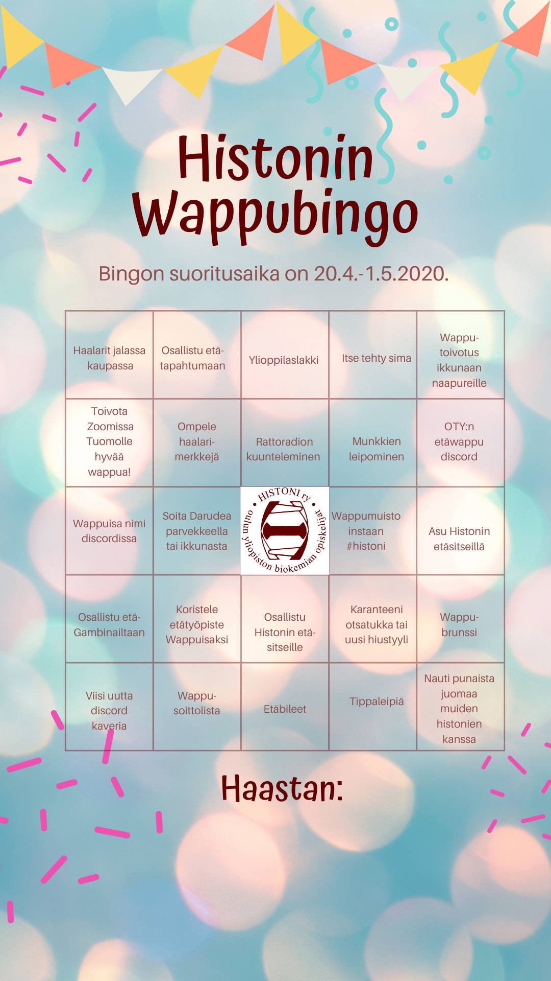 here are the bingo sheets, send them filled out to tiedottaja@histoniry.fimailto:tiedottaja@histoniry.fi or add them to your instastory and tag @histoniry by 1.5 15:00