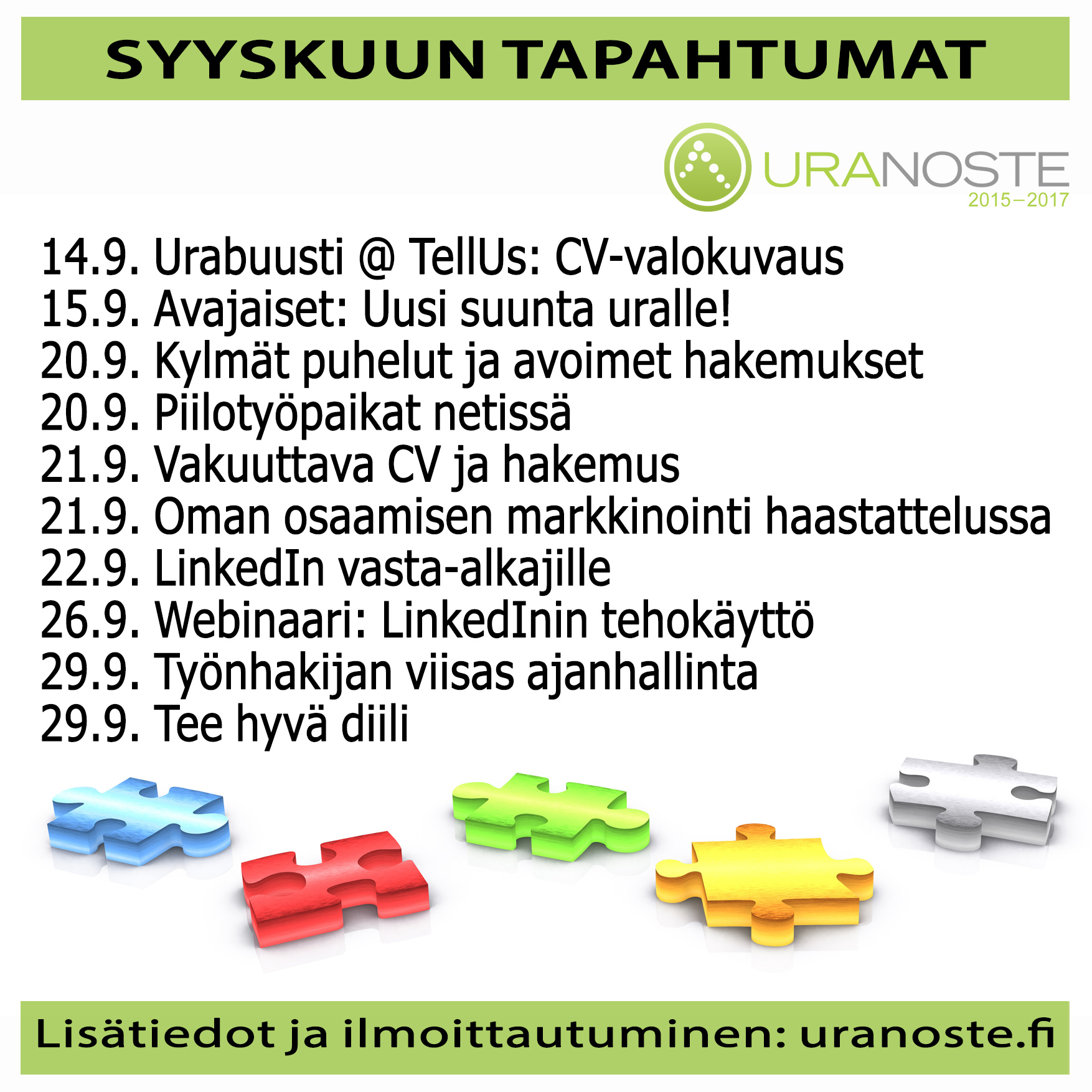 14.9 Urabuusti @ TellUs: CV-valokuvaus 15.9. Avajaiset: Uusi suunta uralle! 20.9. Kylmät puhelut ja avoimet hakemukset 20.9. Piilotyöpaikat netissä 21.9. Vakuuttava CV ja hakemus 21.9. Oman osaamisen markkinointi haastattelussa 22.9. LinkedIn vasta-alkajille 26.9. Webinaari: LinkedInin tehokäyttö 29.9. Työnhakijan viisas ajanhallinta 29.9. Tee hyvä diili