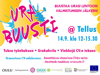 Uranoste tarjoaa syksyn aikana yli 30 maksutonta tapahtumaa työllistymisen edistämiseksi. Syyskausi starttaa Oulun yliopistolla 14.9. Urabuusti @ TellUs -tapahtumalla. Uranoste järjestää tilaisuudessa CV-valokuvauksen, jossa saa ammattivalokuvaajan ottaman kuvan maksutta käyttöönsä (ennakkoilmoittautuminen kuvaukseen Uranosteen nettisivuilla). Uranoste esittelee syysohjelmaansa Ice Breaker Stagella iltapäivän aikana. Tapahtumassa järjestetään myös Urakahvila, jossa alueen hankkeet jakavat vinkkejä työnhakuun.