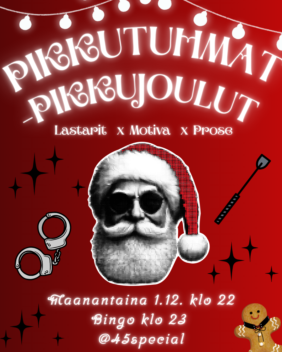 TL;DR MITÄ: Pikkutuhmat pikkujoulut ❤🔥 MISSÄ: 45 Special MILLOIN: 1.12. Klo 22 alkaen! KENELLE: Kaikille!!! MITÄ MAKSAA: 4e/Kide, 5e/ovelta MITÄ PÄÄLLE: Jotain jouluista/tuhmaa + haalarit MIKSI: Koska talvipakkaseen tarvitaan vähän kuumuutta 🥵