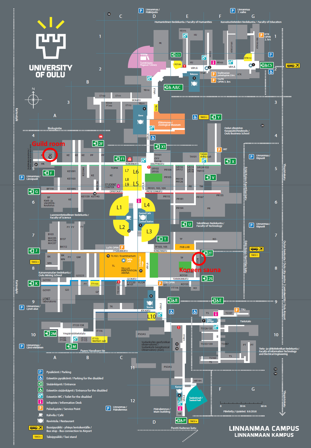 * Saapukaa ajoissa Linnanmaan kiltahuoneelle ryhmänä (klo 15.45) * Ottakaa joitakin juomia mukaanne (suunnistuksesta tekee mukavempaa kun ei janota). Alkoholittomia tai alkoholillisia, sinä päätät sen itse ja kenellään ei ole siihen naputtamista. * Yleensä puolet pisteistä tulee tehtävän suorittamisesta rastilla ja puolet tulee ryhmähengestä, näyttävyydestä ja lahjomisesta. Joten tämän vuoksi kannattaa tuoda omia ruokia & juomia mukananne myös rastivahdeille ja laulun luikauttaminen tai pienen esityksen esittäminen on yleensä riittänyt vakuuttamaan tuomarit. * Suunnistajille ei ole sisäänpääsymaksua. Jos tulet vain Fuksiaisiin (klo 18 @ Koneen sauna, Linnanmaa), niin varaa käteistä kaksi euroa (2 EUR). Fuksiaisissa myydään myös haalarimerkkejä ja t-paitoja, joten kannattaa varata käteistä vähän reilummin! * Sauna lämpiää Fuksiaissa, joten muista OPM x 2 (oma pullo ja pyyhe)